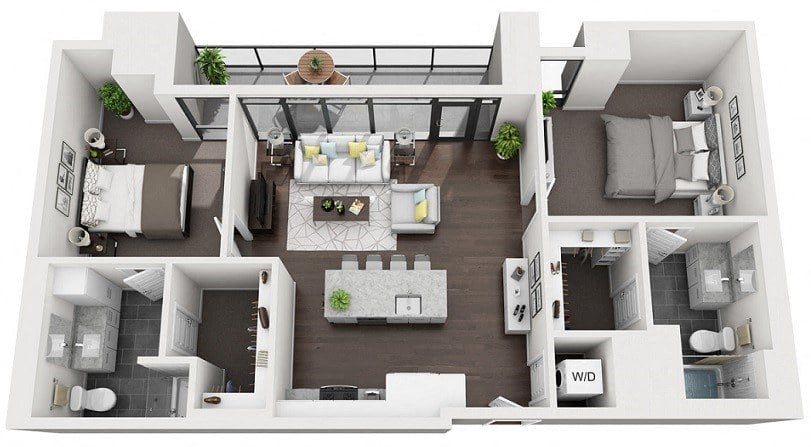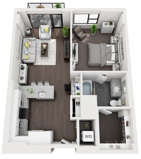 Every apartment combines modern luxury with practical comfort, featuring smoked oak flooring, private terraces, and luxurious soaking tubs. Whether you’re relaxing at home or entertaining, these thoughtfully designed floorplans are your retreat from the lively city.