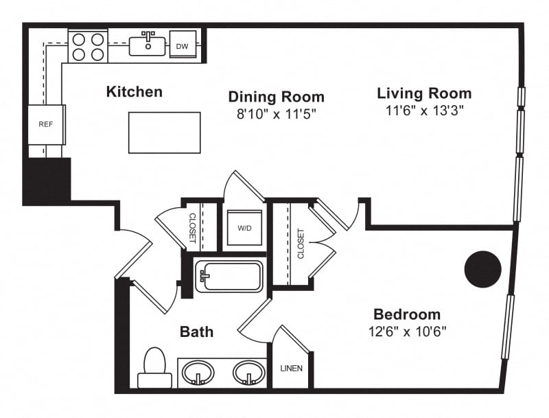 Windsor Cirrus offers spacious studio, one-, and two-bedroom apartments with high-end condo-quality finishes. Each residence features chef-inspired kitchens with GE stainless steel appliances, French-door refrigerators, quartz countertops, and large kitchen islands. Thoughtful layouts ensure maximum space and comfort, with larger floorplans than most downtown communities.