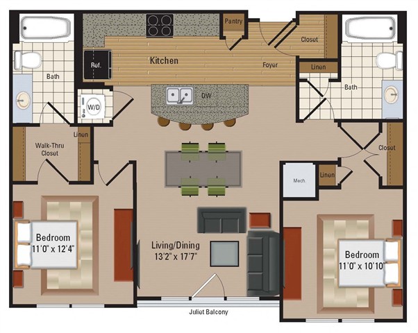 Every home is designed for modern convenience, featuring in-home washer/dryer sets, air conditioners, and Nest thermostats. Gourmet kitchens boast designer 42-inch cabinetry, granite countertops, and GE appliances, with select residences including a kitchen island and additional pantry storage. Luxury vinyl plank flooring and private balconies or patios are available in select homes, providing the perfect blend of style and functionality.